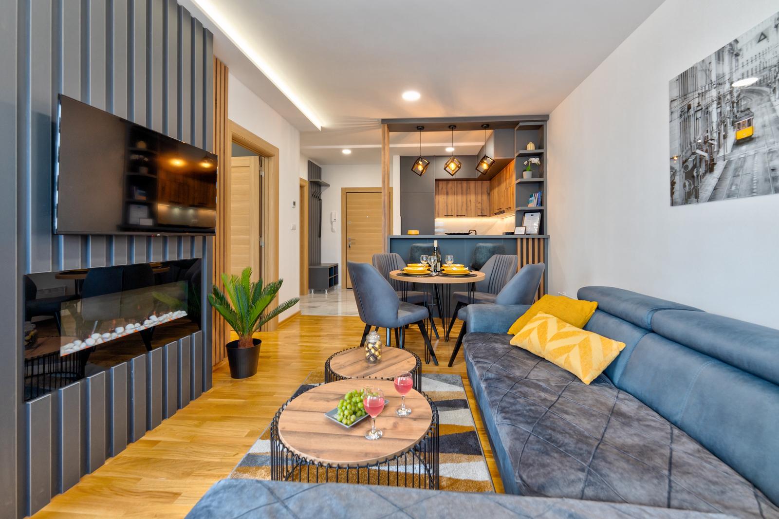 A1 Residence BW, moderno opremljen apartman sa dve spavaće sobe, savršen za udoban boravak u jednoj od najprestižnijih lokacija Beograda – Beograd na Vodi, odmah preko puta TC Galerija.